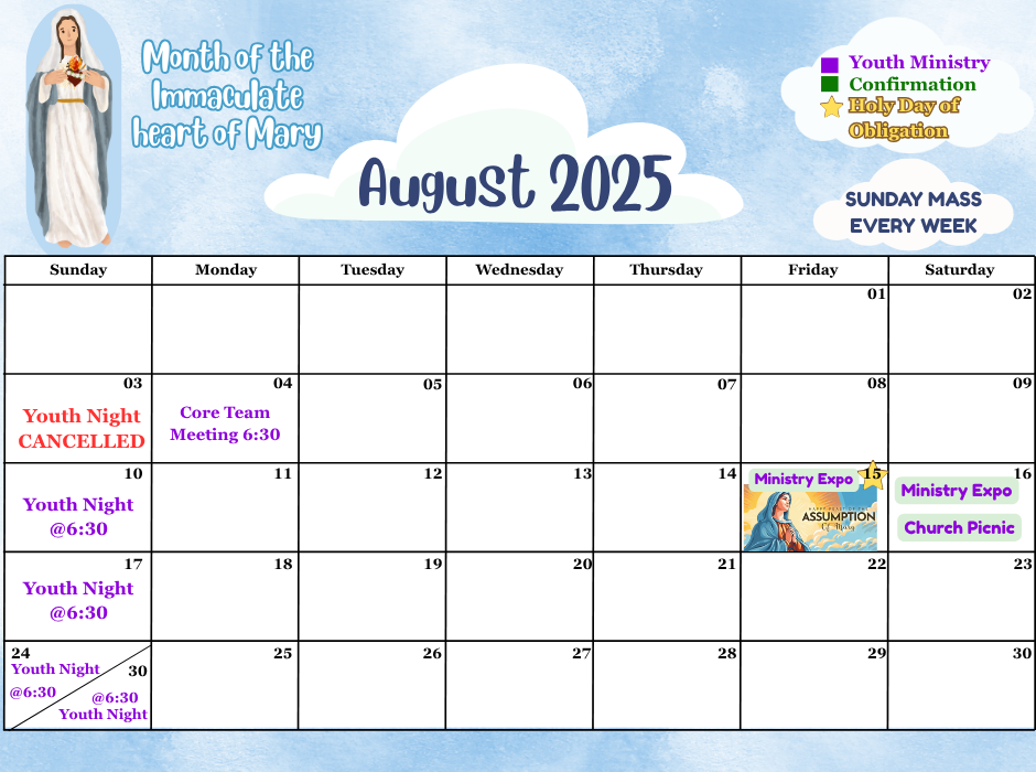 If you have any questions, feel free to contact the Youth Minister at [email protected] or ext. 4215